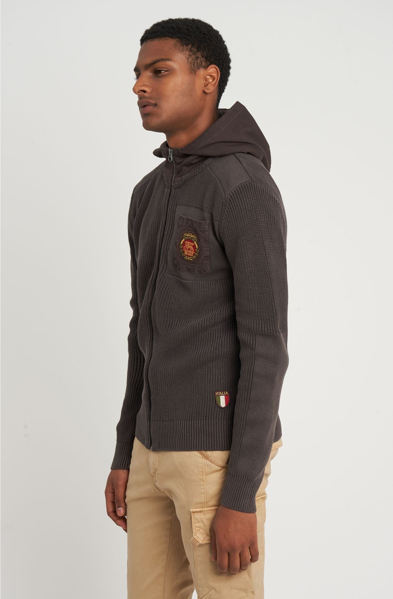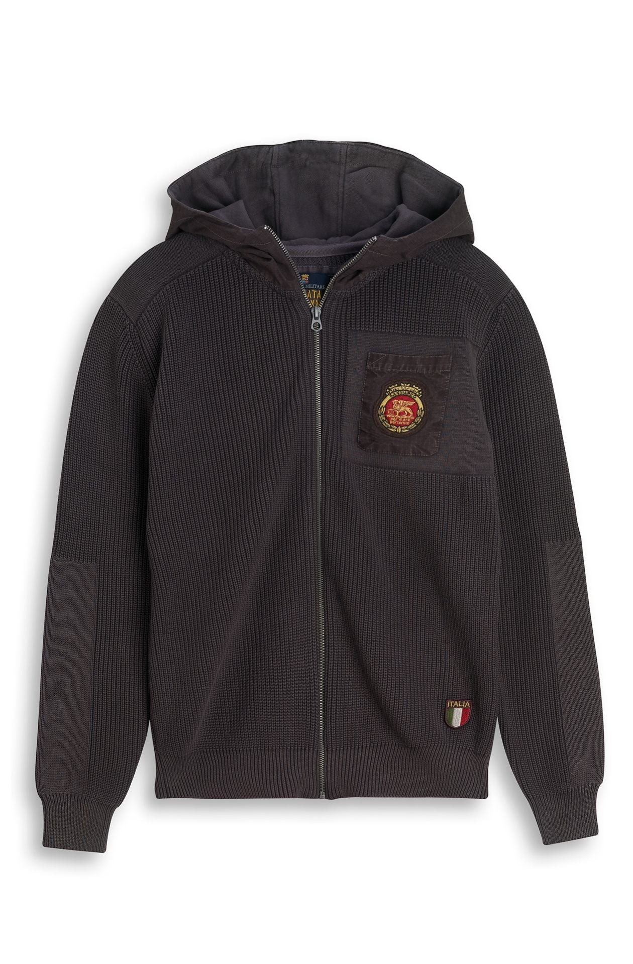 Rippenstrick-Pullover aus reiner Baumwolle mit durchgehendem Reißverschluss aus Metall, Kapuze aus Gabardine, außen mit wasserdichtem Stoff gefüttert. Segeltuchtasche am Herzen, auf die ein mehrfarbig gestickter Aufnäher des Leone Alato-Symbols des Brigata Marina San Marco-Regiments aufgenäht ist.