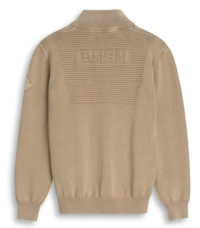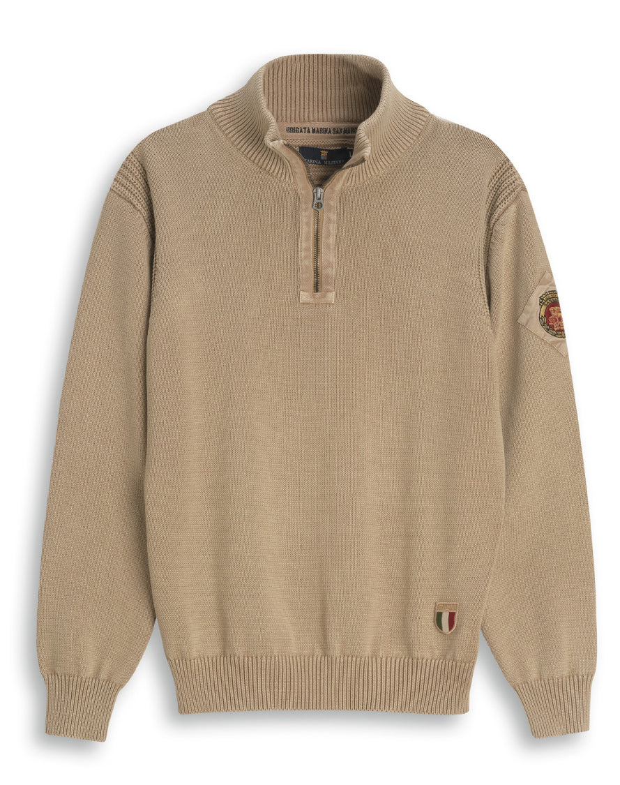 Warmer Baumwollpullover, halber Reißverschluss mit grob geripptem Seidentuch eingefasst. Herringbone-Strick, am Ärmelabschluss verarbeitet. Rippenstrick an Ärmeln und Volant.