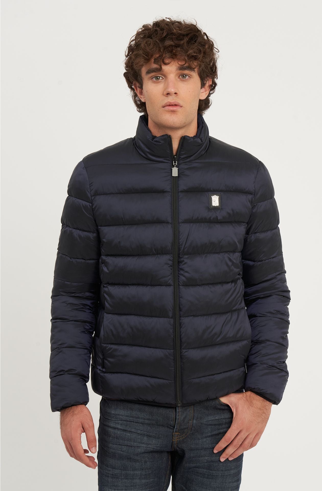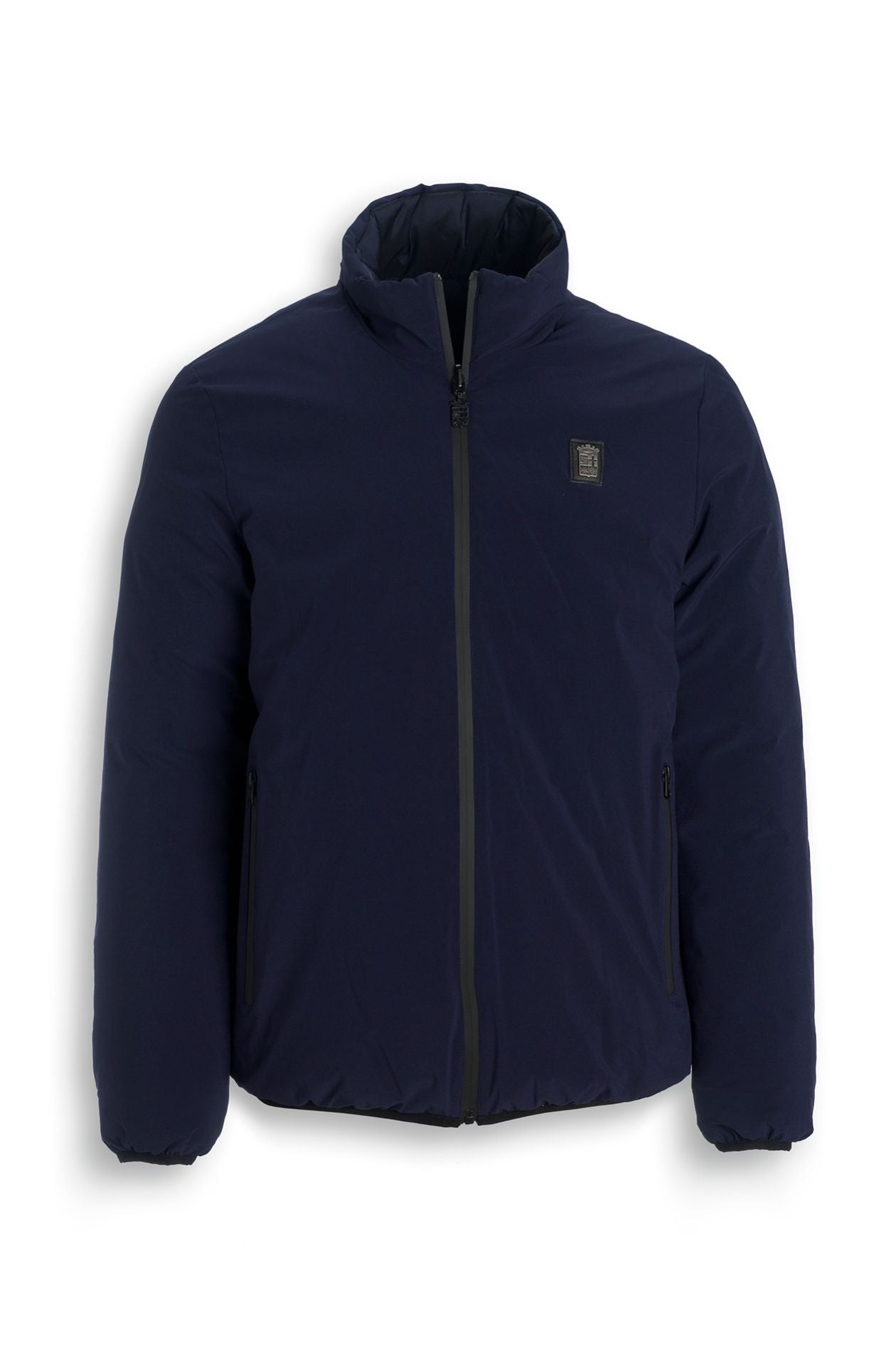 Wendbare Jacke mit durchgehendem Reißverschluss und gepolstertem Stehkragen. Eine Seite aus glänzendem Nylon mit horizontalen Nähten und geformtem Logoaufnäher aus Metall auf dem Herzen, verdeckte Reißverschlusstaschen. Die andere Seite aus glattem Spandex-Gewebe, Aufnäher auf dem Herzen. Gummierter durchgehender Reißverschluss, ebenso wie die Reißverschlüsse der Taschen an der Hüfte. Ärmel und Hüftabschluss aus elastischen Paspeln. Einfach und bequem für die Freizeit.