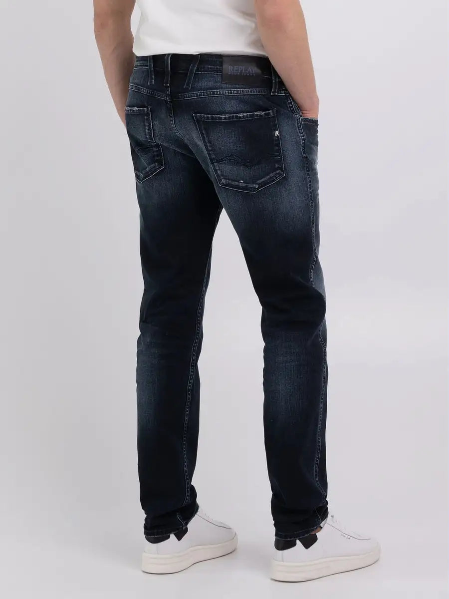 Slim Fit Jeans mit normaler Taillenpassform, weichem zur Unterkante enger werdendem Beinschnitt und bequemem Tragekomfort. Das Modell mit authentischem Look ist aus blauem, schwarz überfärbtem 10,5 oz-Baumwollstretch-Denim mit dunkler Stonewashed-Behandlung gefertigt. Buffies verleihen der Fünf-Taschen-Jeans mit Abwetzungen an den Kanten Farbkontraste an den meist beanspruchten Stellen. Verschluss mit Knopf und Reißverschluss.