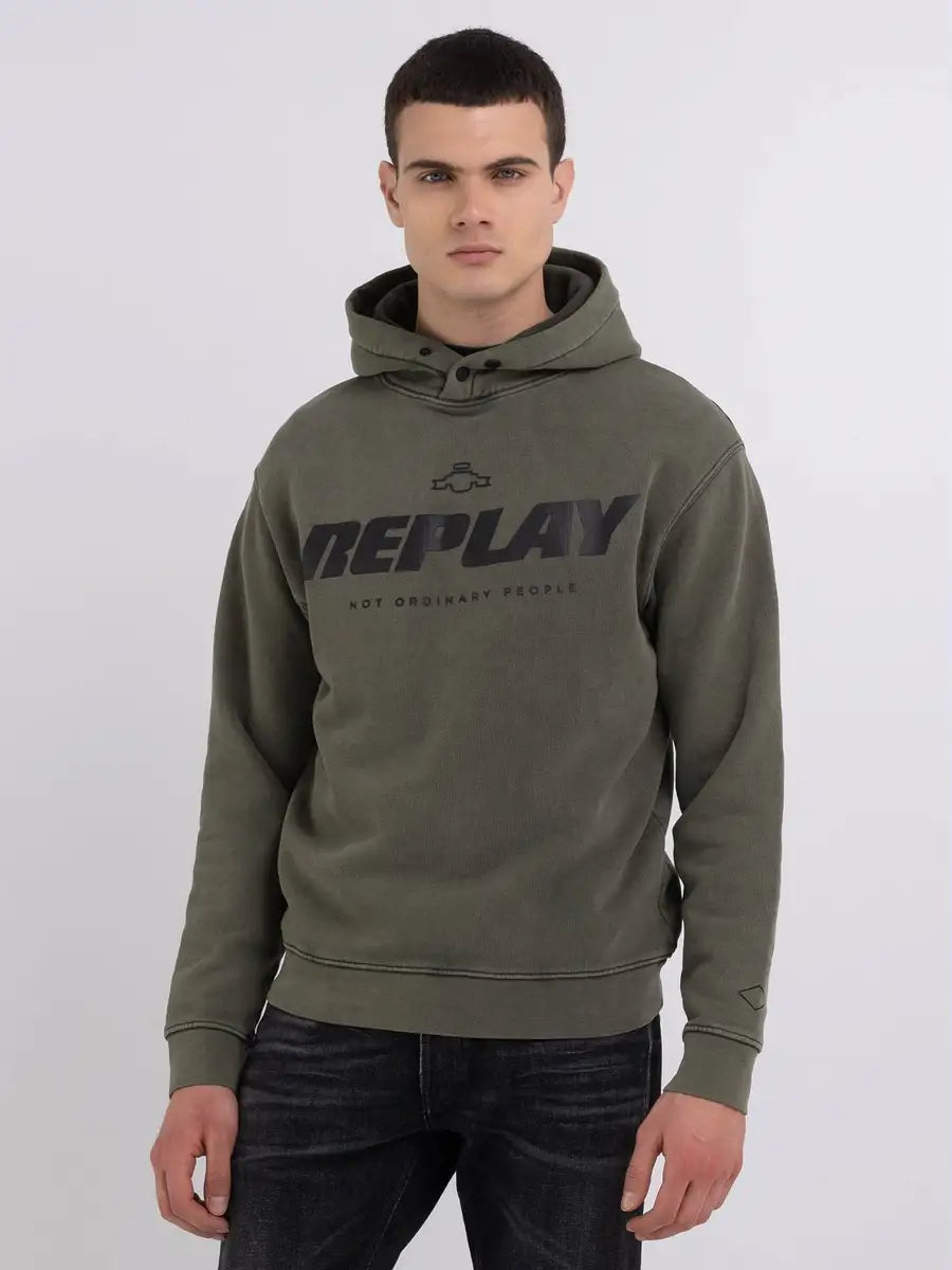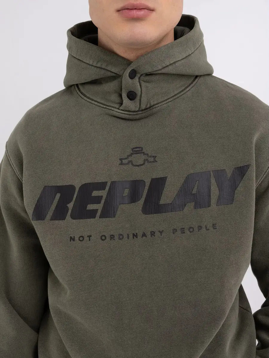 Sweatshirt mit Kapuze aus weicher und warmer st ckgef rbter Baumwolle in geb rsteter Optik. Das Modell hat eine entspannte Passformund einen Kragen mit doppeltem Druckknopf. Ein rautenf rmiges Logo am  rmelende und ein Replay-Aufdruck mit Archivio-Logo an der Vorderseite runden das Teil ab.