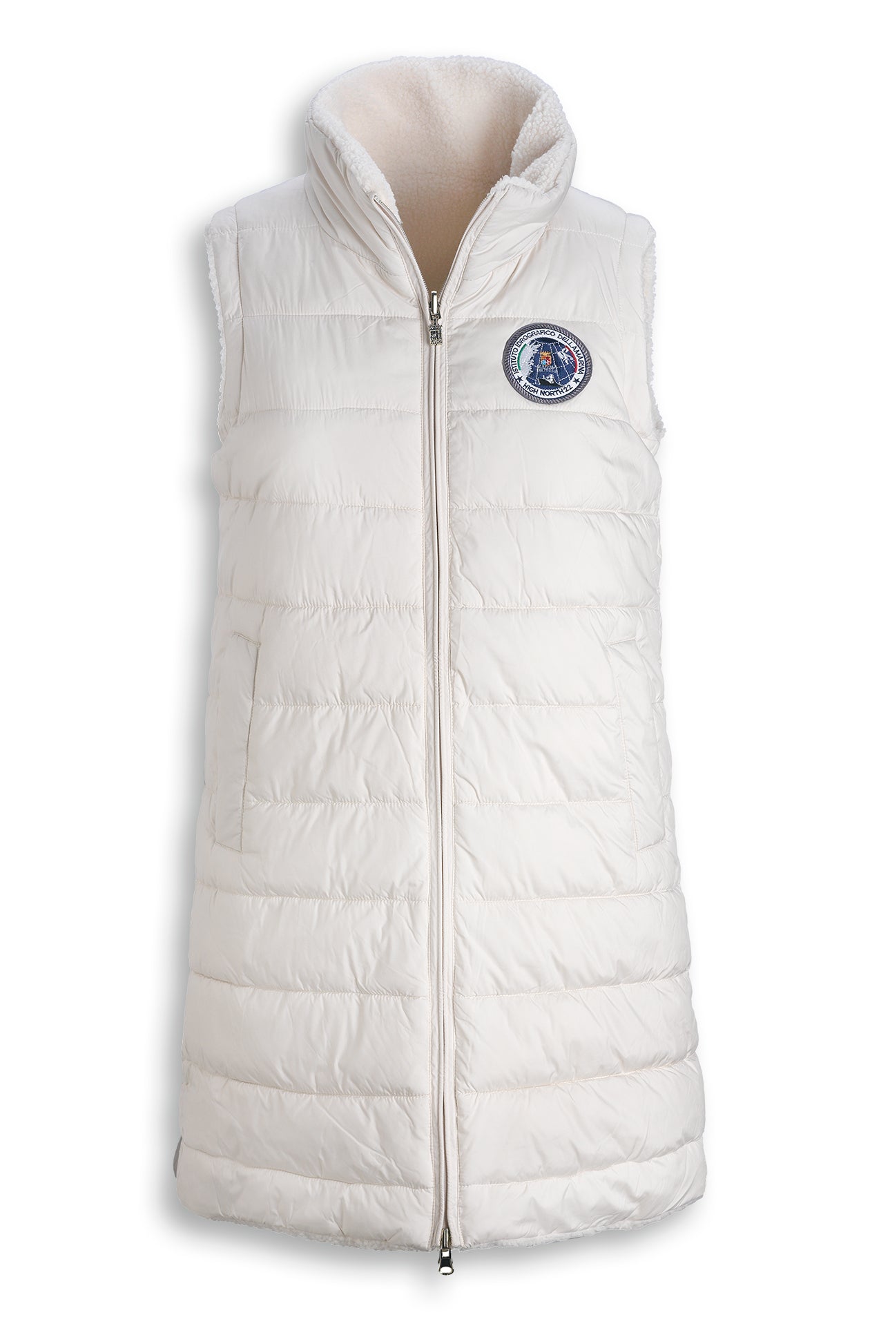 Bequeme, ärmellose Wendejacke der Linie HIGH NORTH 22. Auf einer Seite ist sie mit horizontalen Streifen abgesteppt, auf dem Herzen ist ein mehrfarbiges Expeditions-Abzeichen aufgenäht. Offene Eingrifftaschen.