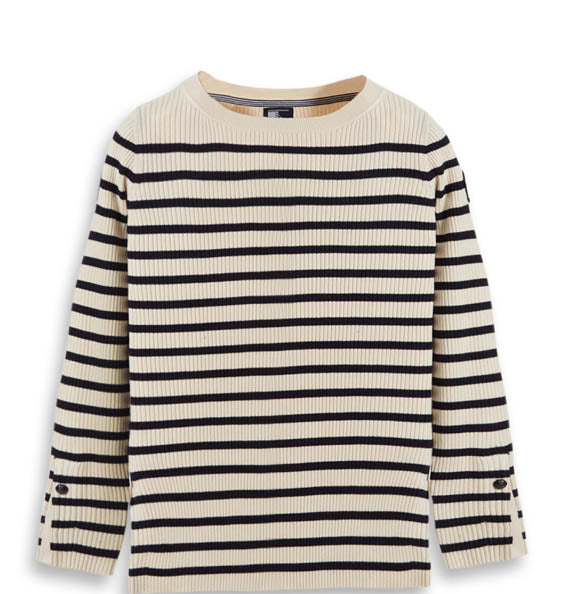 Langarm Pullover aus Viskosemischgewebe, breiter Halsausschnitt. Gerades Modell mit Seitenschlitzen, Cannettè-Verarbeitung. Aus einem horizontalen Streifenmuster. Der Saum der Ärmel ist offen, mit einem personalisierten Emaille-Knopf. Ein Modell, das an die Tradition der Seefahrt erinnert.